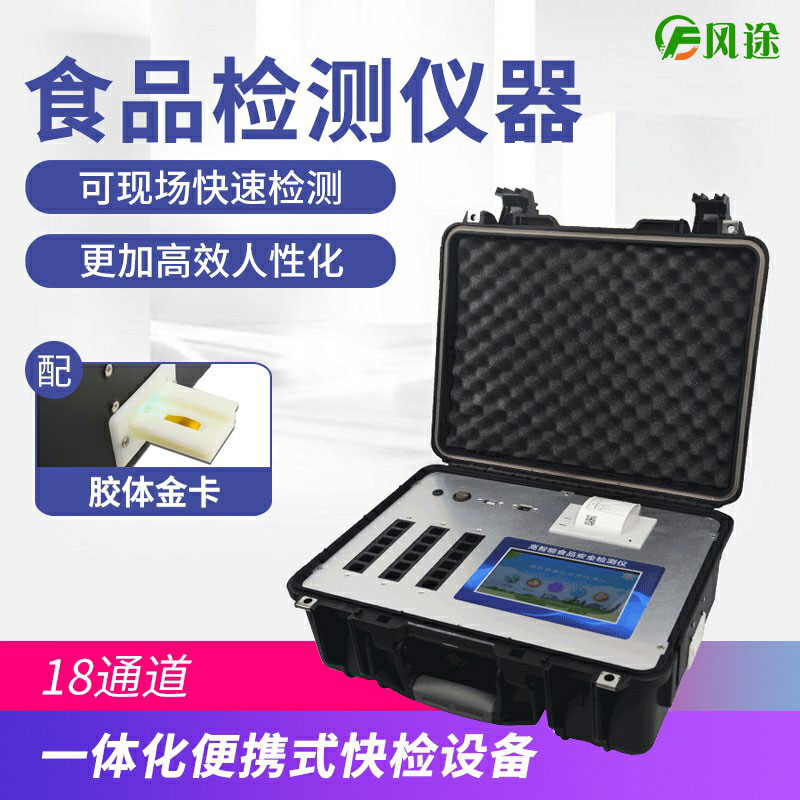 風途多功能食品安全檢測儀可現場快速檢測非食用化學物質、濫用食品添加劑、農藥殘留、獸藥殘留、重金屬、抗生素類殘留、激素類殘留、毒素類殘留、化學類殘留等200多項目的快速定性定量檢測。如甲醛、二氧化硫、吊白塊、過氧化氫、亞硝酸鹽、蛋白質、蜂蜜果糖和葡萄糖、蜂蜜中蔗糖、過氧化值、酸價、白酒中的雜醇油、鉛、汞砷、錫、鎘、硼砂、苯甲酸鈉、甜蜜素、木耳中硫酸鎂、芝麻油純度、油脂丙二醛、溴酸鉀、余氯、谷氨酸鈉、揮發性鹽基氮、山梨酸、糖精鈉、飲料中維C、醬油氨基酸態氮、肉制品酸價、水中氰化物、水發產品中組胺、蜂蜜定粉酶、蜂蜜酸度、羅丹明B、三聚氰胺、鹽酸克倫特羅、沙丁胺醇、萊克多巴胺、四環素類、硝基呋喃類、磺胺類、沙星類、氯霉素、孔雀石綠磺胺類等快速檢測。
